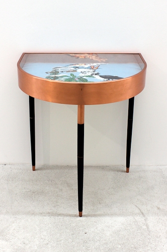 ca. 90 x 85 x 60, Kupfer, Holz, Stickerei, Glas